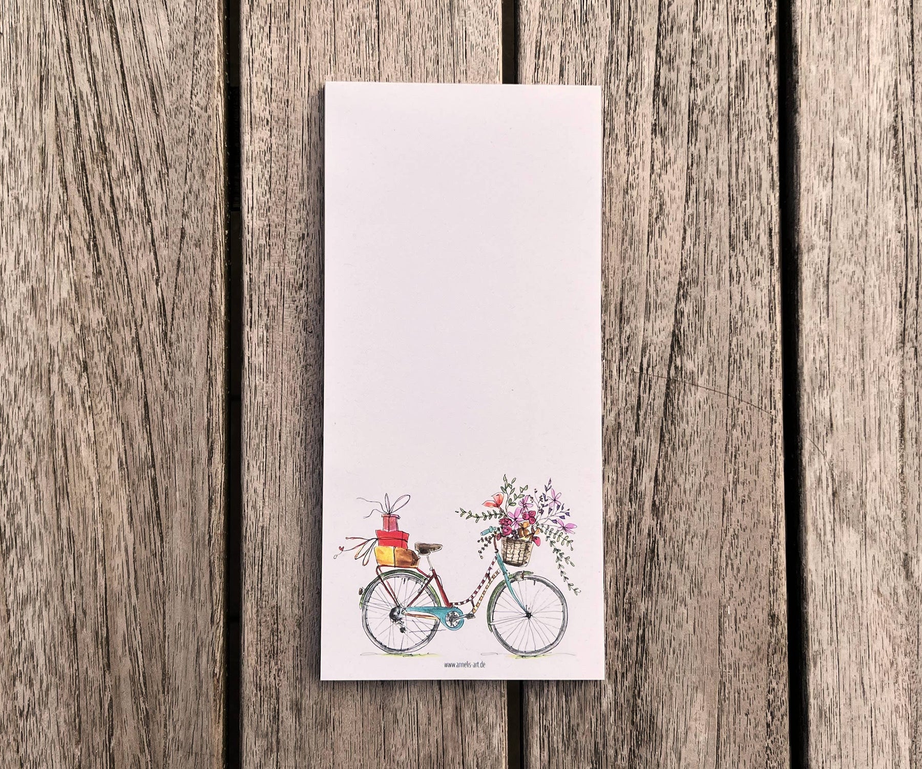 Schöner Notizblock mit Fahrradmotiv in Aquarelloptik. Nachhaltig aus Recyclingpapier, 50 Blätter mit Leinbindung. Perfekt für kreative Notizen und Skizzen.