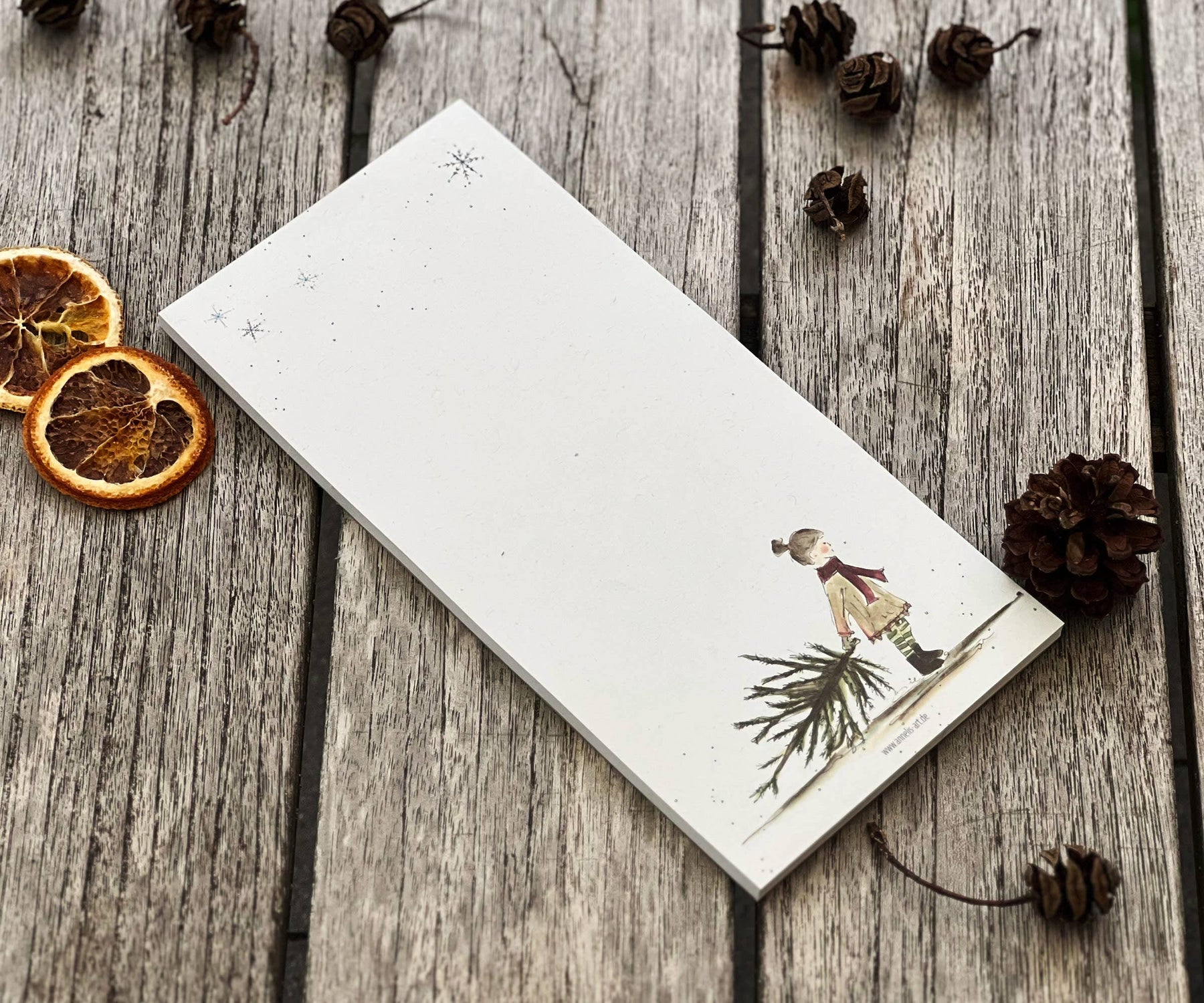 Ein Hauch von Winterzauber auf jedem Blatt: Der weihnachtliche Notizblock von Annelise Art bringt die warme Atmosphäre vergangener Adventstage zurück. Das liebevoll gestaltete Aquarell zeigt ein kleines Mädchen, das in Mantel und Mütze eine Tanne hinter sich herzieht – ein Bild, das an verschneite Kindheitstage erinnert und sofort Vorfreude auf Weihnachten weckt.